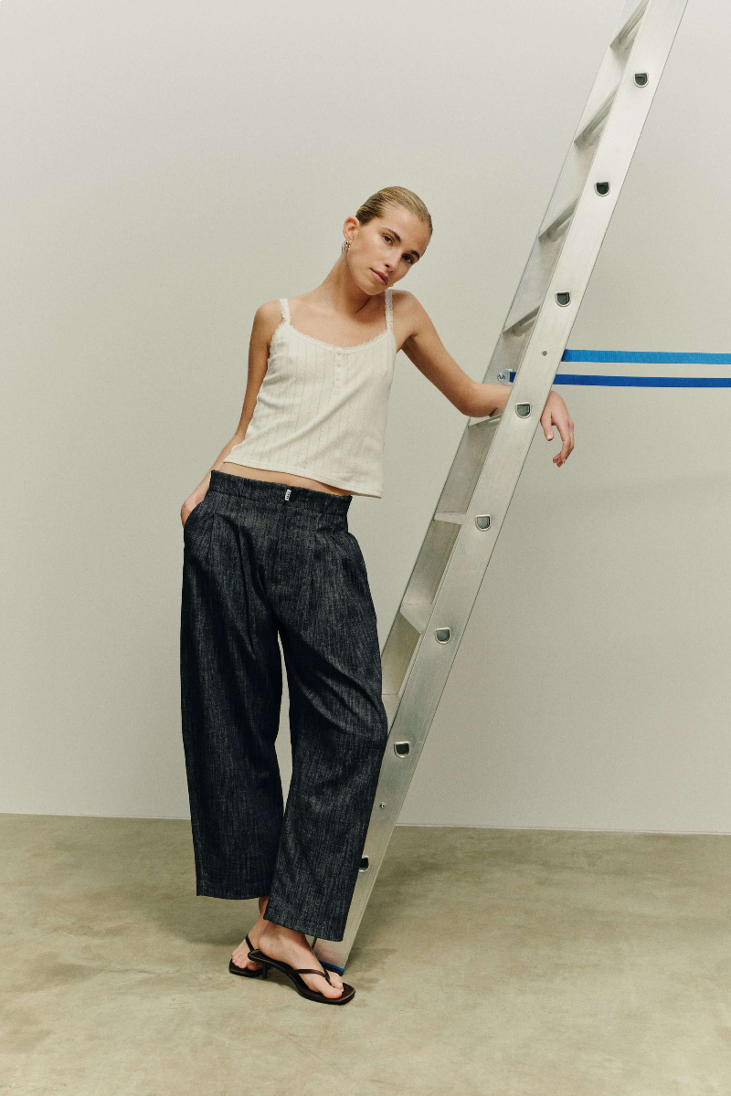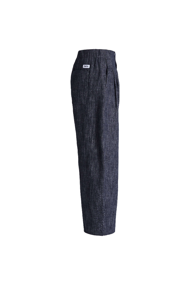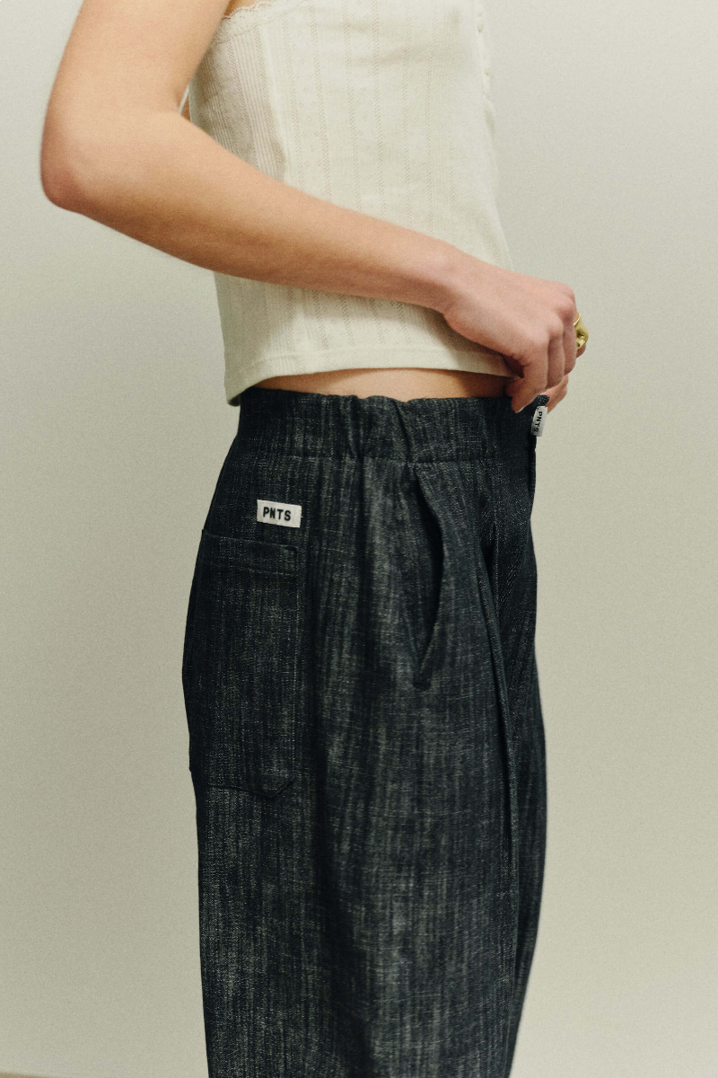Die 35_The Mini L von PNTS kommt in einem fake Denim mit leicht strukturiertem Fischgratmuster. Sie kombiniert den lässigen Look von Jeans mit komfortablen Trageeigenschaften ohne abzufärben oder auszubluten. Die MINI L hat einen Gummibund und eingearbeitete Bundfalten. Sie ist locker, voluminös geschnitten und hat eine ankle length.