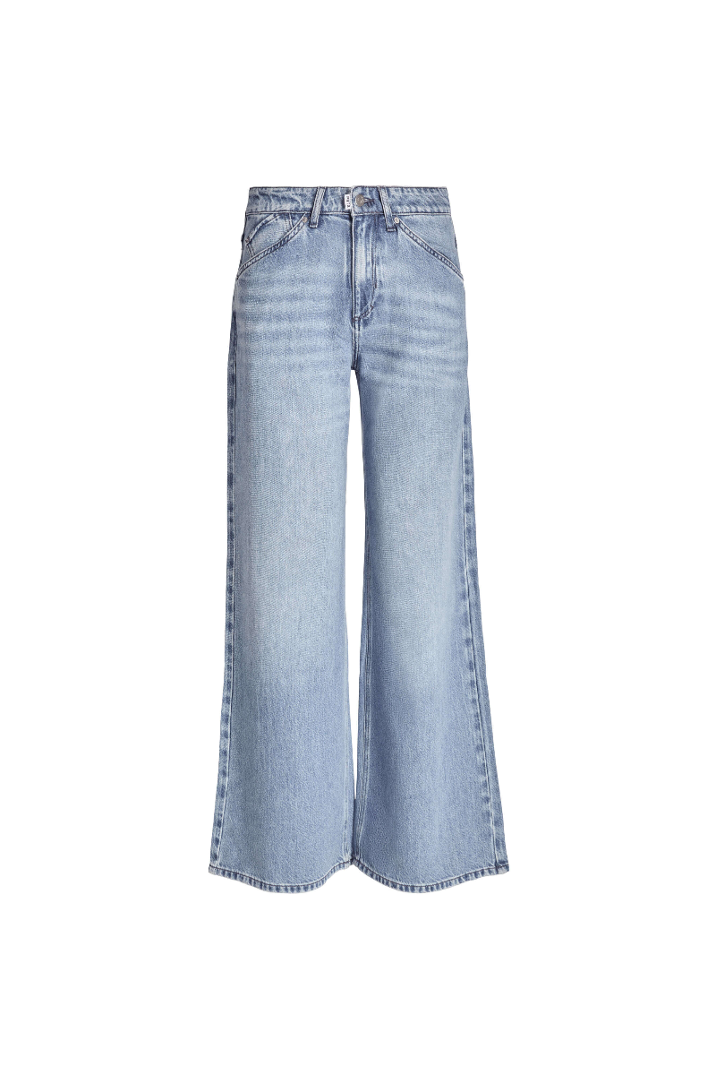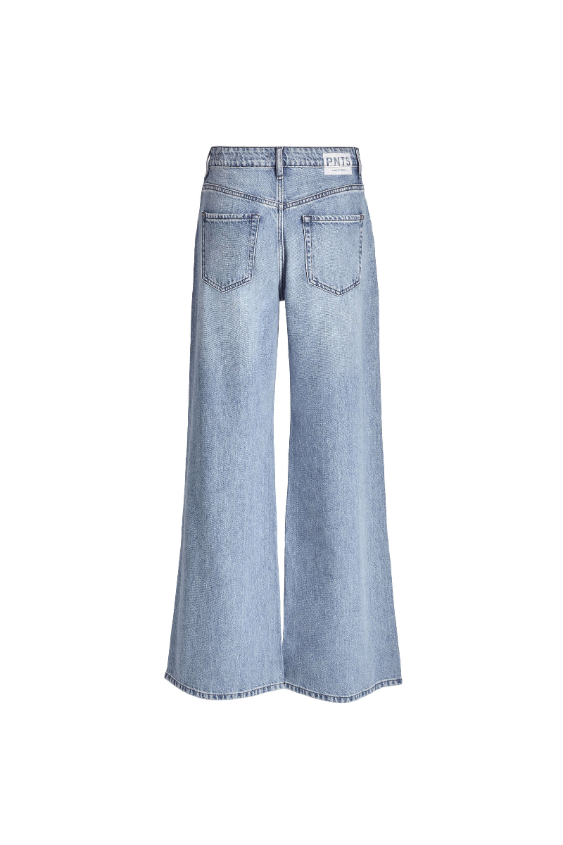 Die Denim 16_The Raver von PNTS kommt in authentischer light Organic Denim Qualität. Sie hat eine hellblaue Waschung mit helleren Abriebstellen sowie eingearbeiteten Permanent-Sitzfalten. Die 5-Pocket-Form hat eine hohe Leibhöhe und ein sehr weites, überlanges Bein.