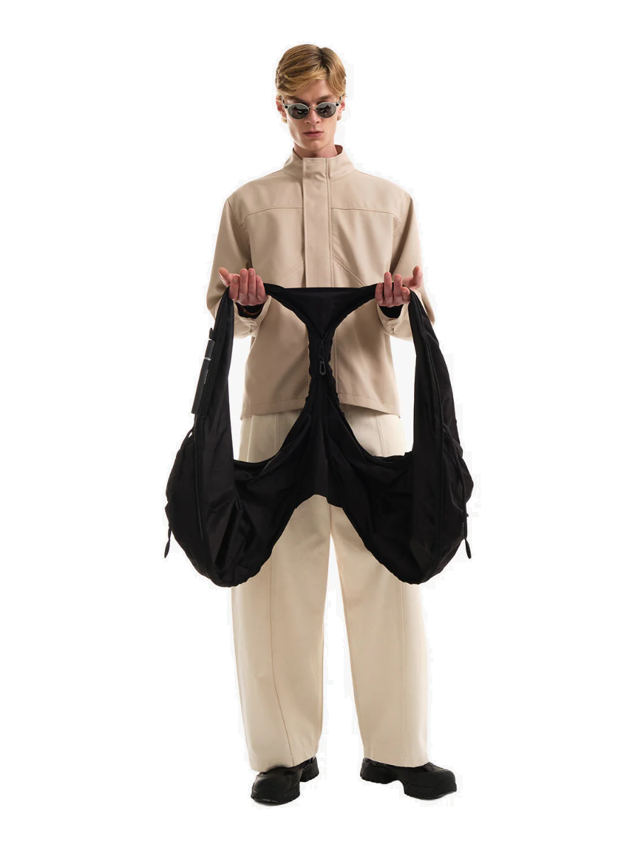 Nach origami-inspirierten Prinzipien zeigt die Struktur der PO eine Reihe von komplexen Schichten, die entweder in Taschen- oder Westenform repliziert werden. Die Außenseite verfügt über eine Reihe versteckter Taschen und D-Ring-Clips zum Befestigen kleiner Gegenstände.