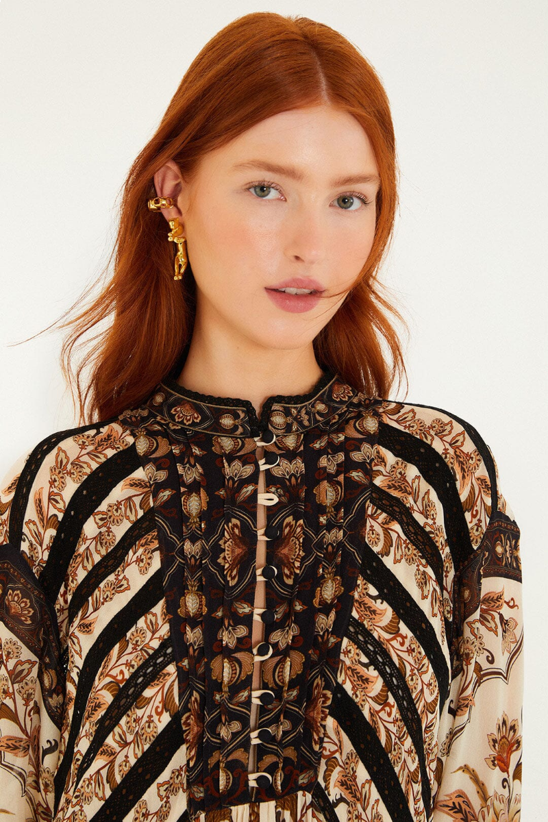 Treten Sie ein in einen skurrilen Garten mit dem Sand Majestic Garden Lace Long Sleeve Minikleid von FARM Rio. Der zarte Spitzenstoff erstrahlt in sanften Sandtönen und hüllt Sie in einen romantischen hohen Ausschnitt und luftige lange Ärmel.