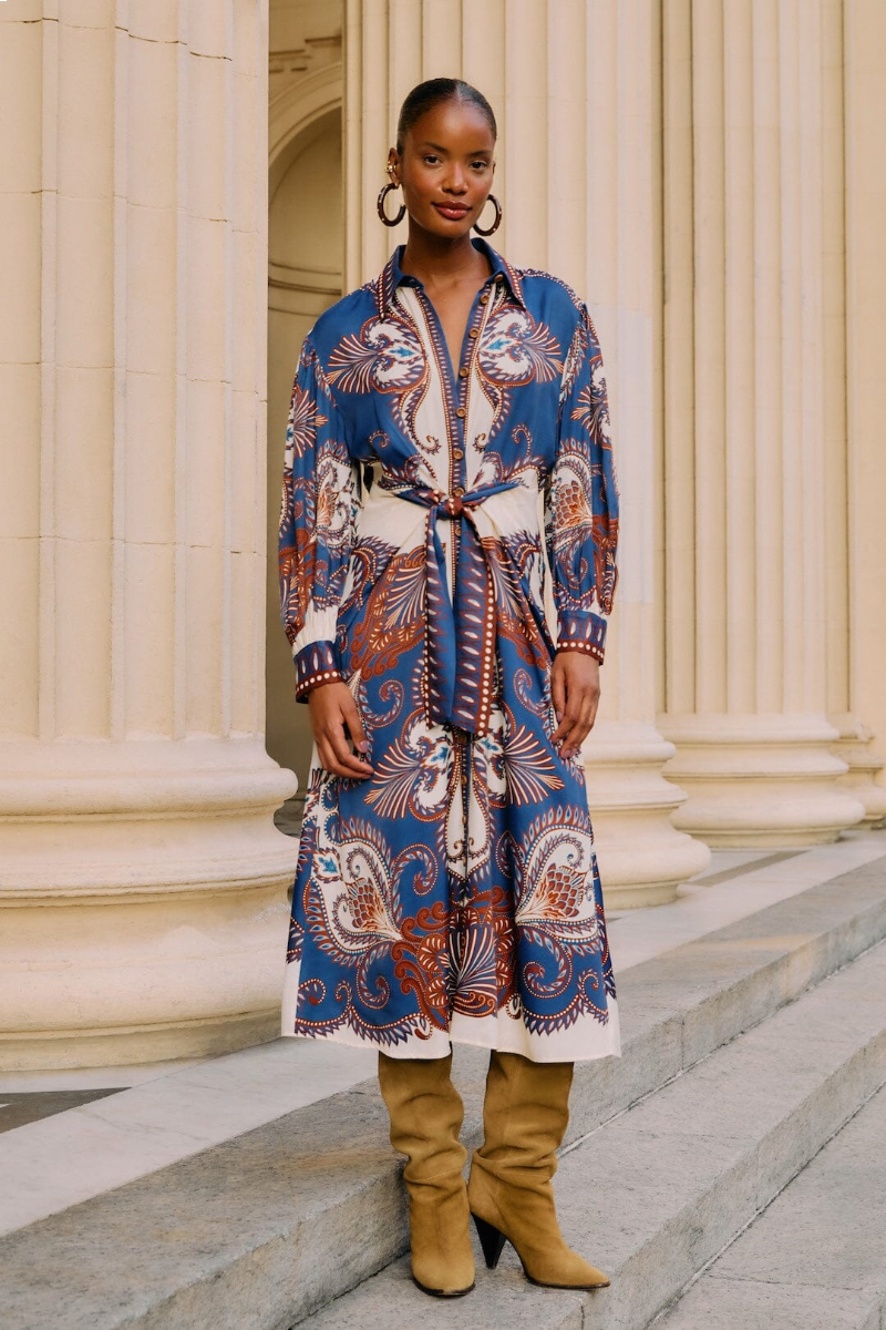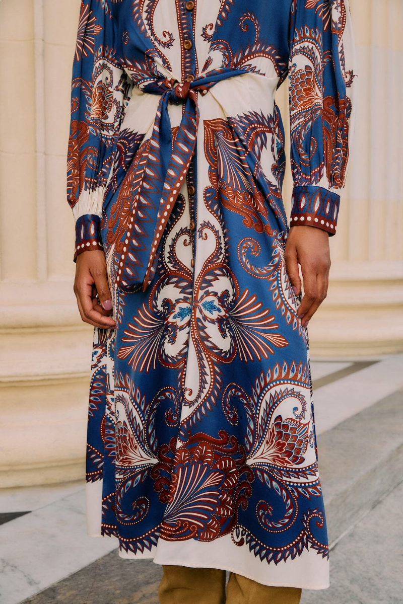 Dieses Midikleid von FARM RIO ist in leuchtend blaue Arabeskenmuster gehüllt und fließt mühelos mit seinem weichen Lenzing™ Ecovero™ Viskosegewebe. Der Kragenausschnitt sorgt für einen Hauch von klassischem Charme, während die verspielte Silhouette bei jedem Schritt mittanzt.