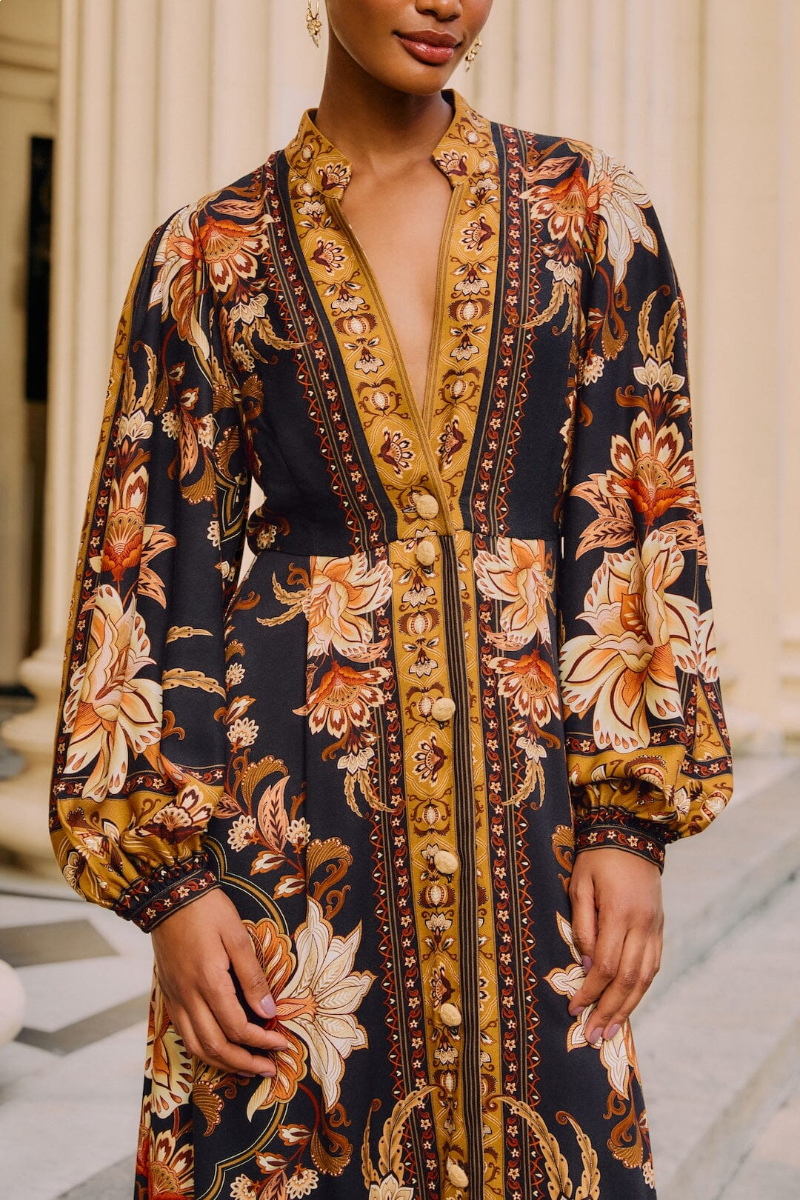 Genieße mühelose Eleganz mit dem Black Majestic Garden Maxikleid mit Knöpfen und Puffärmeln von FARM RIO. Dieses fesselnde Stück verfügt über einen tiefen V-Ausschnitt, der wunderschön umrahmt, während voluminöse Puffärmel für einen skurrilen Touch sorgen.