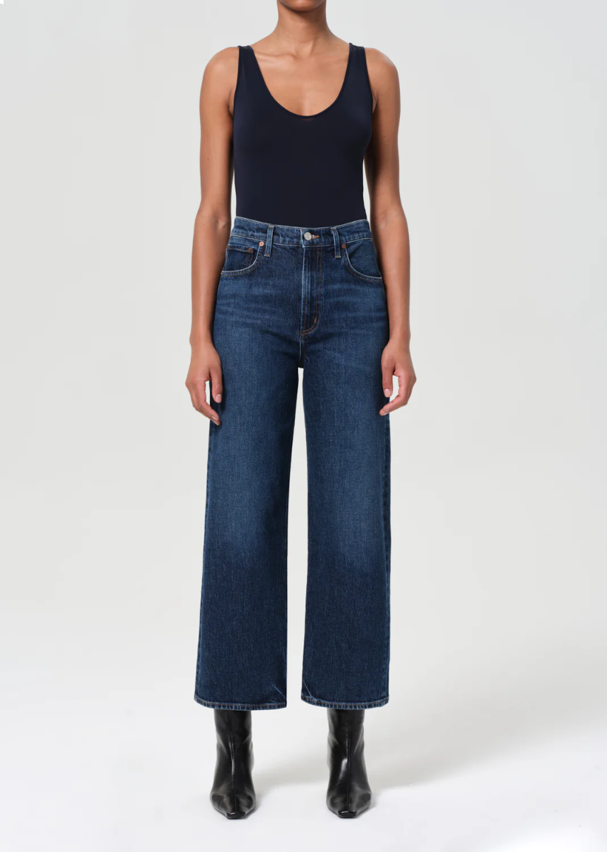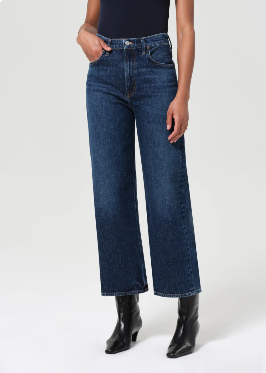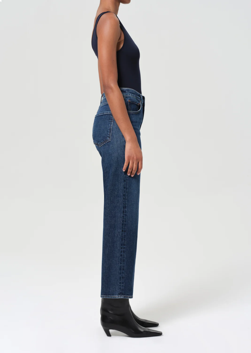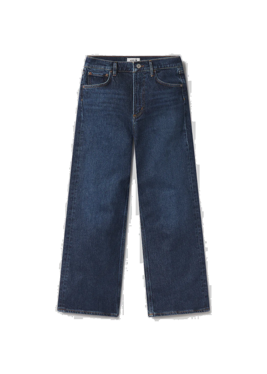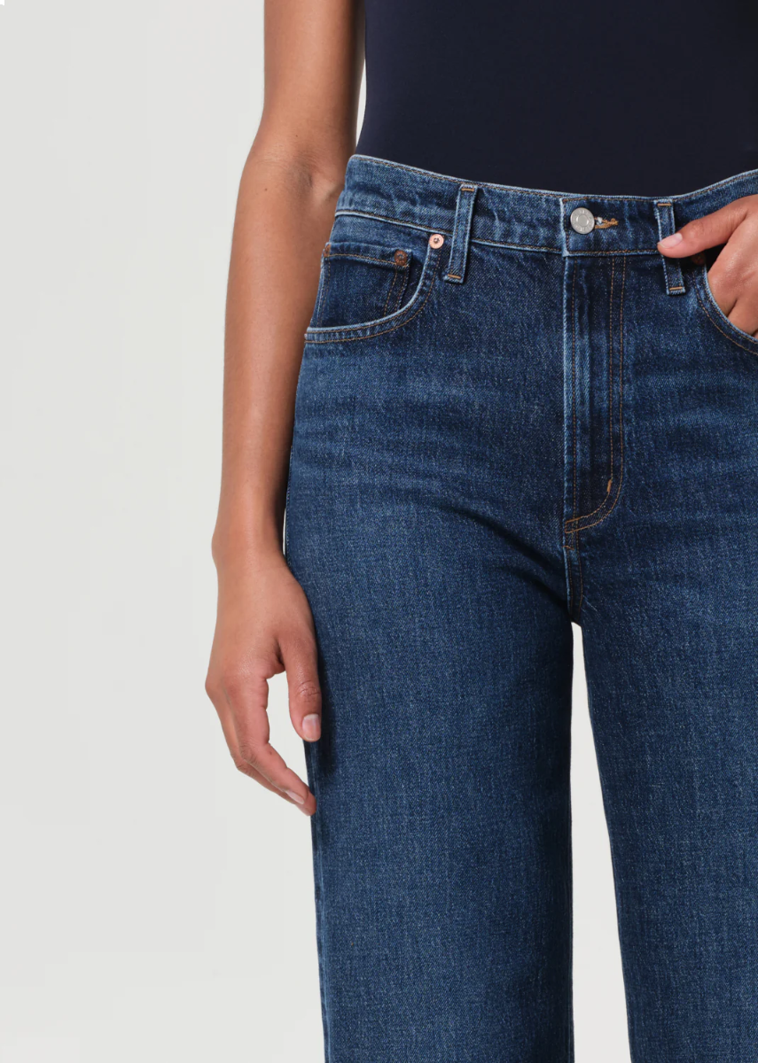 Die Ren-Jeans von AGOLDE werden aus recycelter Baumwolle gefertigt und bieten eine entspannte Passform mit hoher Taille und kürzeren weiten Beinen.
