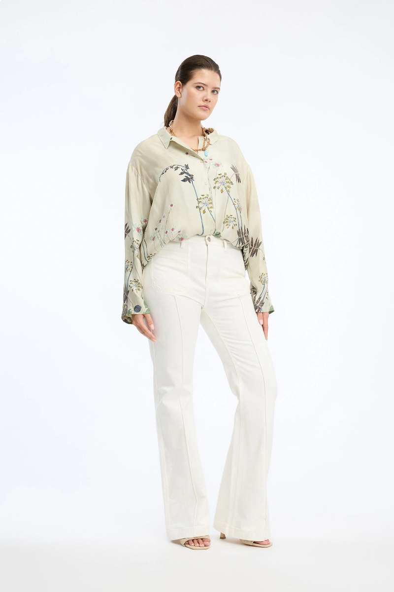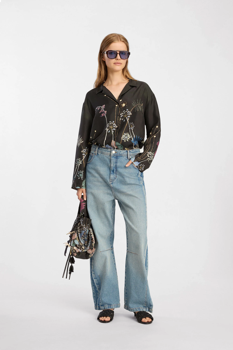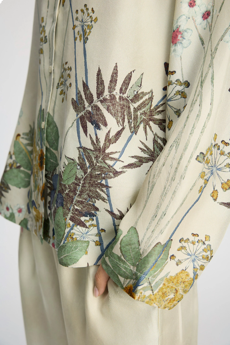 Bluse von MUNTHE aus 100% Seide mit zartem botanischem Print. Klassischer Kragen, lange Ärmel und lockere Passform.