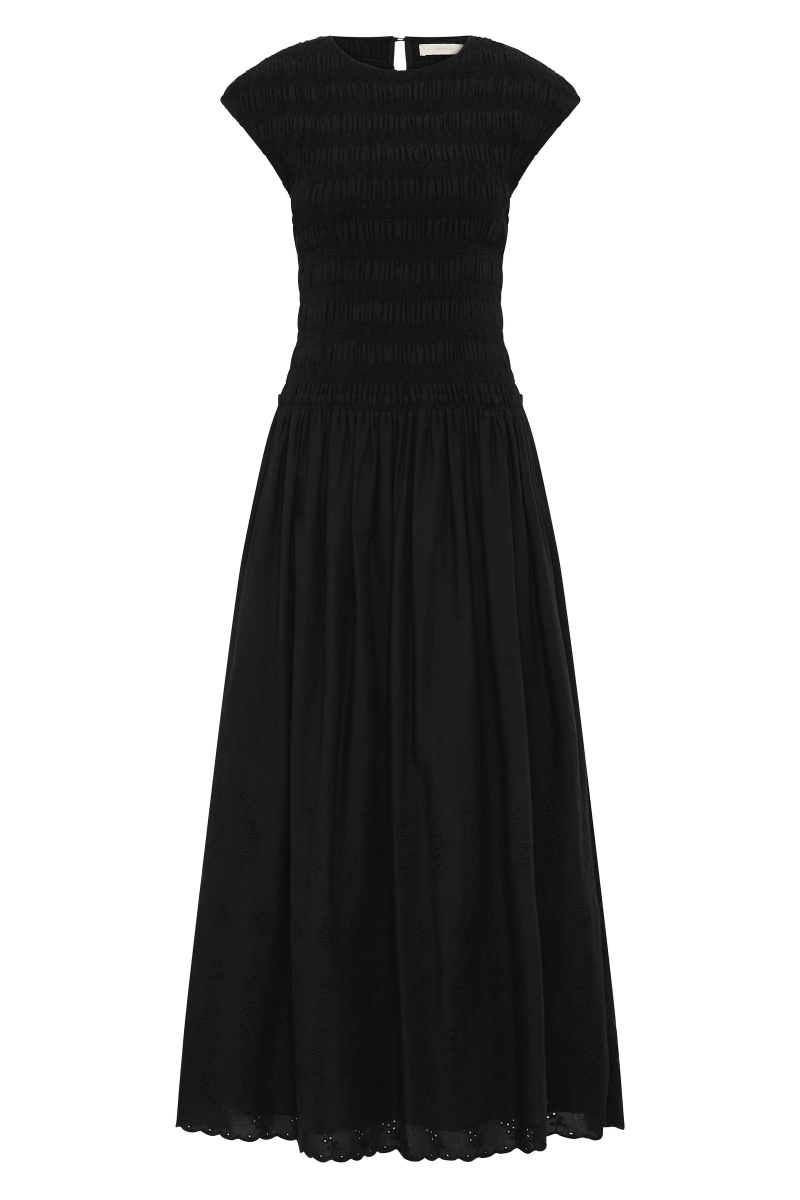 Ein zeitloses Maxikleid, entworfen von FAITHFULL aus einer einzigartig zarten englischen Broderie-Fertigung in klassischem Schwarz. Mit einem hohen, abgerundeten Ausschnitt und einem geschirrten Oberteil mit kurzen Mützenärmeln, der von der Taille aus zu einem gerafften A-Linien-Rock ausfällt.