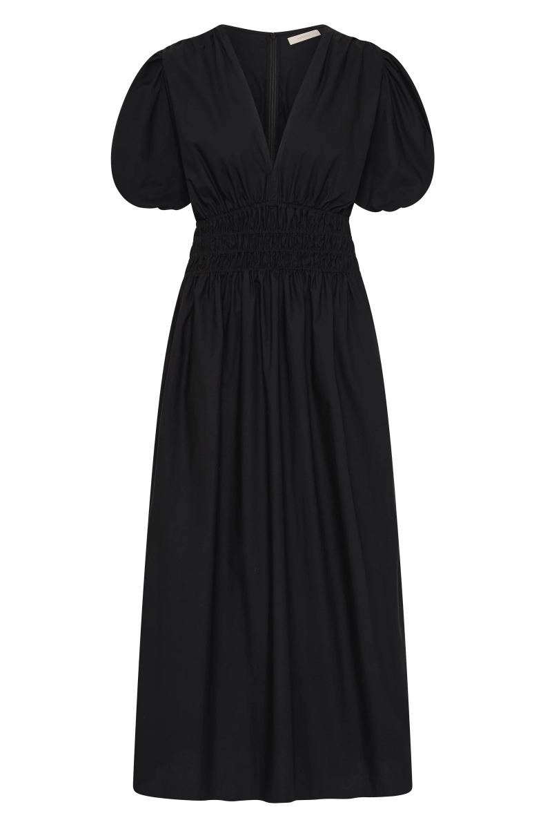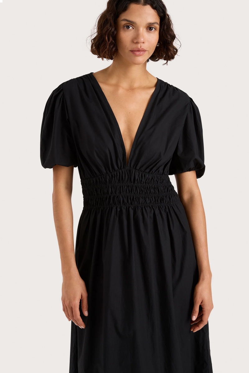 Eine charakteristische FAITHFULL-Silhouette, neu interpretiert mit neuen, gehobenen Details und entworfen aus 100 % Baumwolle. Es ist ein schmeichelhaftes, aber feminines Midi-Kleid mit tiefem V-Ausschnitt und übergroßen Puffärmeln.