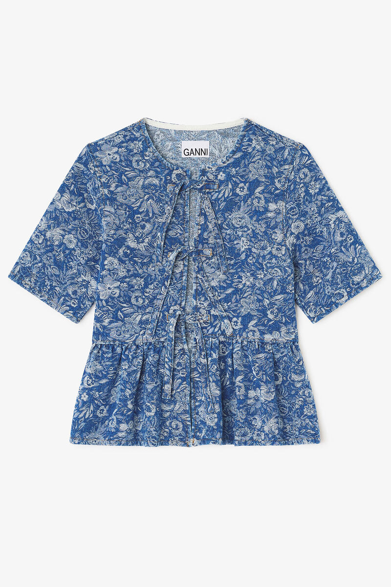 Dieses Oberteil von GANNI hat einen Rundhalsausschnitt, kurze Ärmel und einen vorderen Binderverschluss.