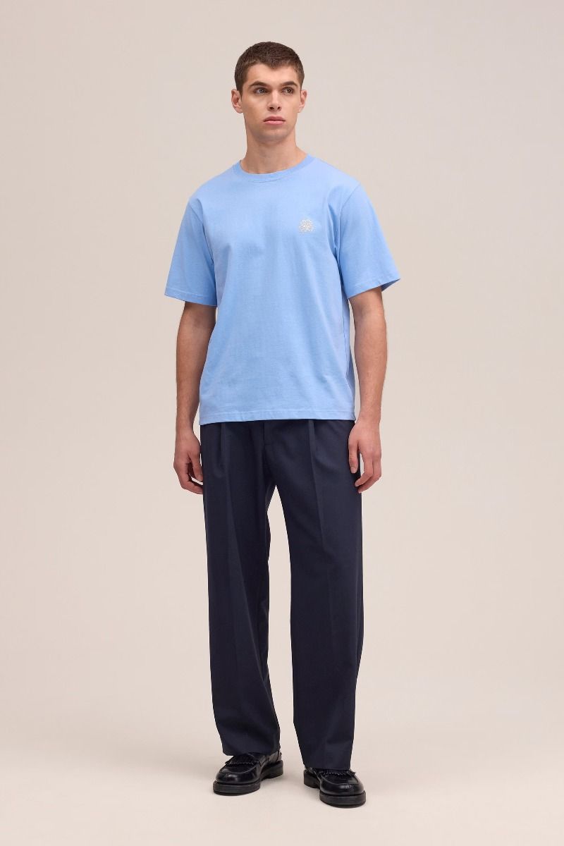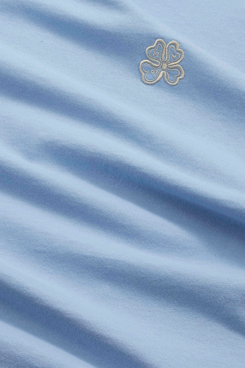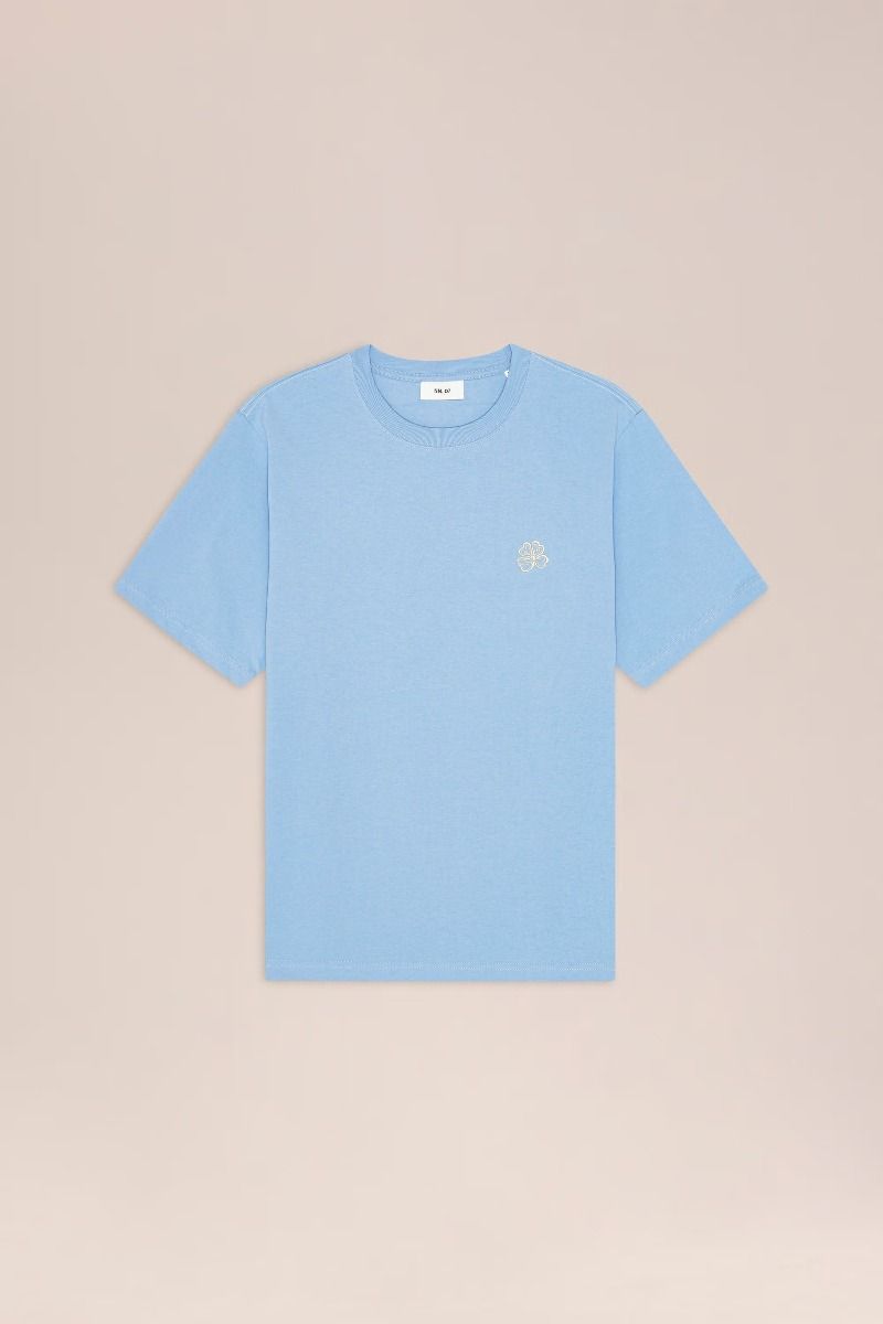 Mittelschweres T‑Shirt von NN.07 im regular Fit aus Bio‑Baumwolle mit trockener, strukturierter Haptik und stabiler Form. Abgerundet durch eine kleine vierblättrige Kleeblatt‑Stickerei auf der Brust und Doppelnähte für zusätzliche Haltbarkeit.