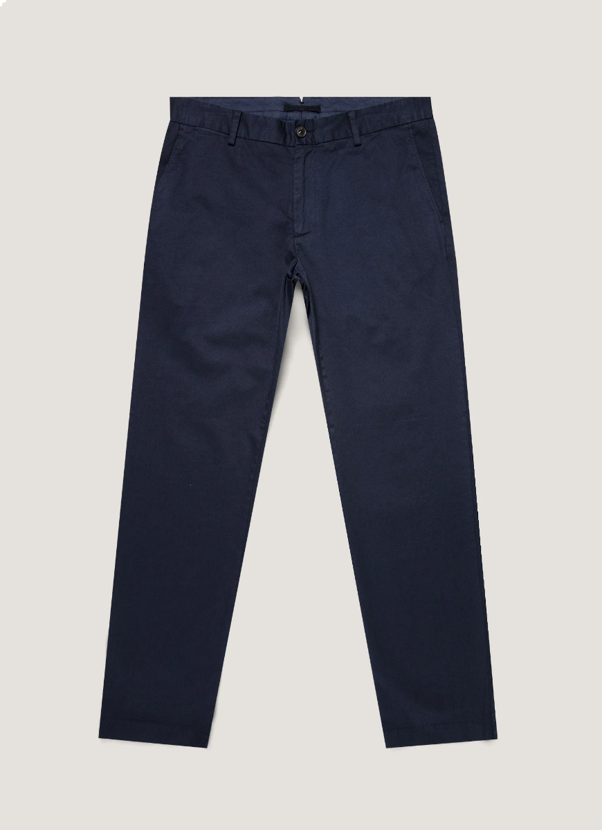 Eine schmal geschnittene Chinohose von SUNSPEL mit mittlerer bis niedriger Taille und klassischem, flachem Vorderteil. Hergestellt aus leichtem italienischem Baumwollstoff mit einem Hauch von Stretch für zusätzlichen Komfort.
