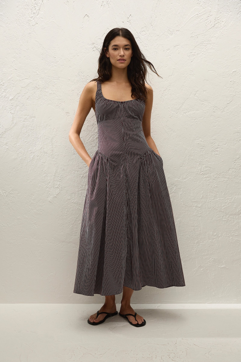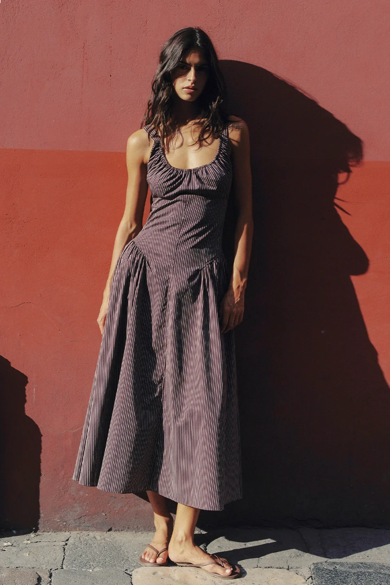 Ein zeitloses Midi-Kleid, entworfen von FAITHFULL aus einem charakteristischen 100% Baumwollstoff mit Schokoladen-Pflaumenstreifen. Sie ist durch das Oberteil mit einem Scoop-Ausschnitt und geraffter Brust geschnitten, mit einer Taille-Silhouette in Höhe und weiteren Raffen an den Seiten. Von dort aus fällt es in einen weichen A-Linien-Rock.